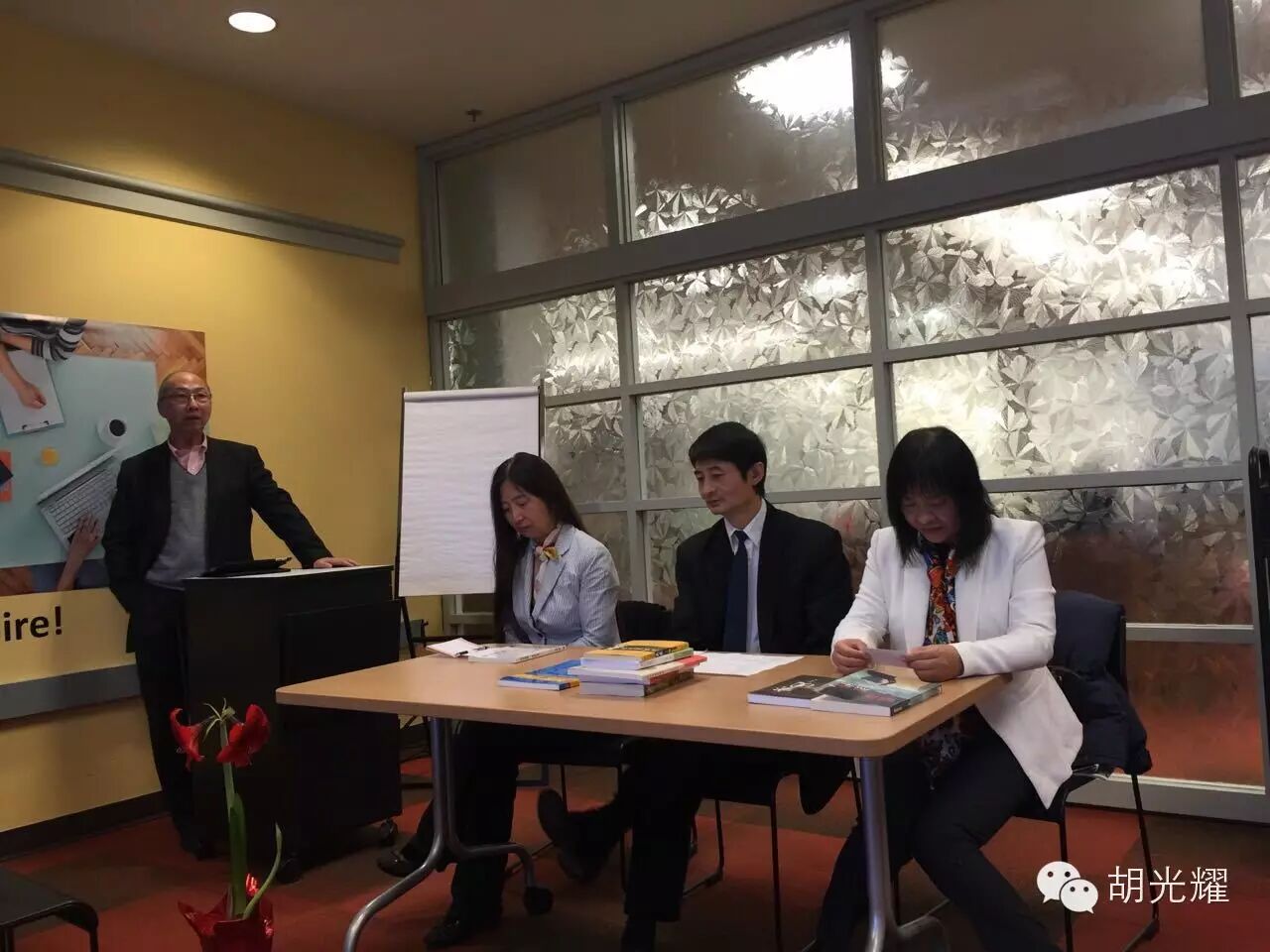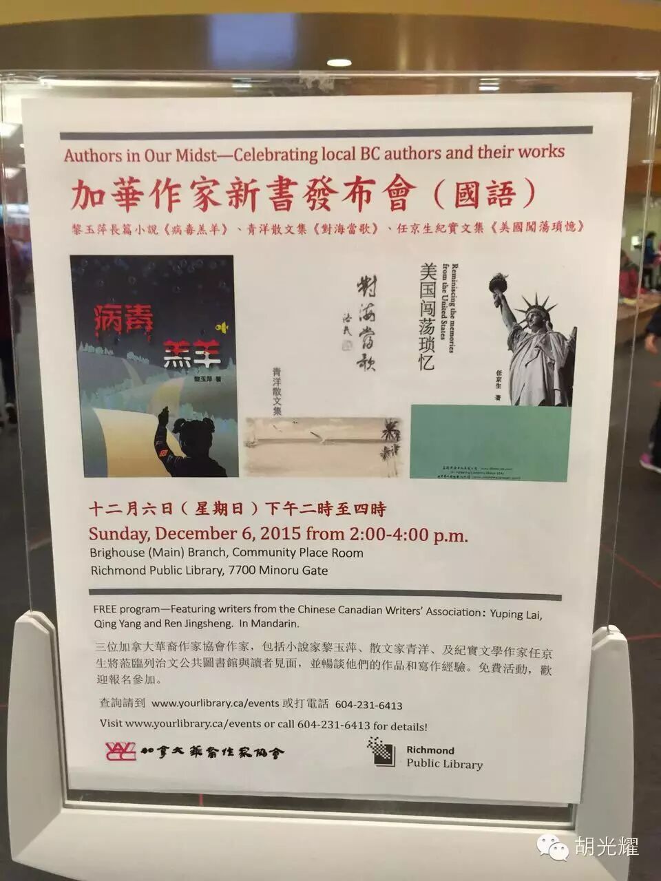 十二月六日,加华作协的黎玉萍、任京生、青洋三位好友在列治文图书馆举办新书发布会,胡光耀先生应邀出席了此次活动。来自当地文学界知名人士数十人共同聆听了三位的创作经过和心路历程。
