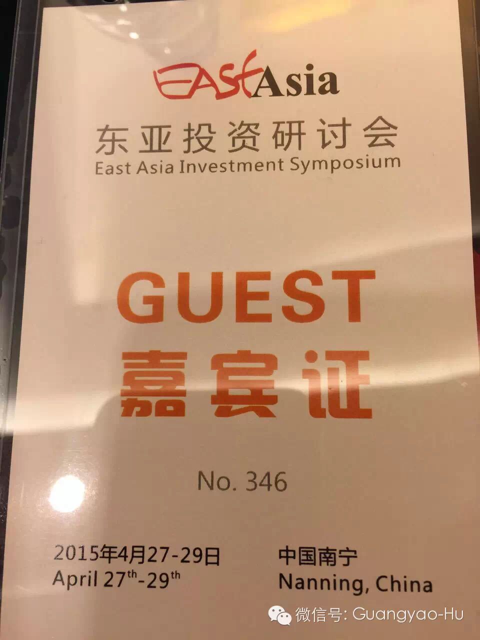 应中国贸促会和东亚商务理事会中国委员会联络办公室的邀请,胡光耀先生代表“时光财富”(加拿大时光财富投资集团有限公司、“耀达资本”(香港耀达国际投资集团有限公司)、金创黄金(上海)有限公司广西分公司出席今天(2015.04.27)在广西南宁举办的“东亚投资研讨会”。